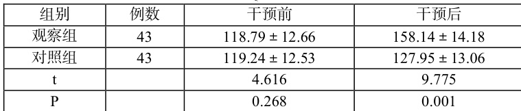 1.1 研究资料:选取 2024 年1 月~2024 年12 月本院神经内科收治的脑卒中吞咽障碍患者 86 例,随机分为观察组和对照组两组,各 43 例。对照组中男 24 例,女 19 例,平均年龄( 63.8±3.2 )岁;观察组中男 22 例,女21 例,平均年龄( 64.1±3.6 )岁。纳入标准为:(1)符合中国神经分会制定的脑卒中诊断标准;(2)经初步筛查证实存在吞咽障碍;(3)处于疾病稳定期;(5)意识清晰,沟通正常;(6)能配合研究及问卷调查;(7)知情同意本研究。排除标准为:(1)患有其他影响吞咽的疾病者;(2)经鼻饲予肠内营养者;(3)急性期或生命体征不稳定者;(4)意识障碍或无法正常沟通者;(5)不能配合研究及问卷调查者;(6)因各种原因退出研究者。两组患者一般资料比较,具有可比性( P>0.05 )。