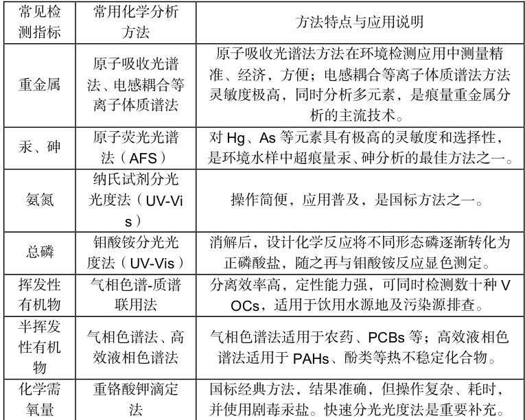表 1:主要化学分析方法在水环境检测中的应用以及特点