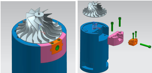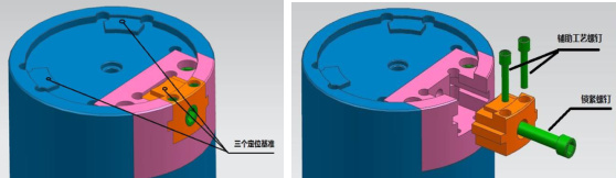叶轮的夹紧主要依靠两个部分,一个是叶轮下面的 M10 螺纹,另一个是直径 133.56 的外圆。上面提的三个基准面解决了叶轮 Z 轴方向上的定位和限位,为使叶轮能够稳定加工,还要限制叶轮在 X轴和 Y 轴上的移动自由度。在夹具上设计了一个直径 133.58 的圆形沉头,深度为 2mm,因为 M10 的螺纹只有 Z 轴方向上的锁紧功能,没有定位功能,更不能提供 X 轴和 Y 轴方向上的加紧,所以在夹具设计的时候设计了如图 2-4 所示加紧机构,通过这个简单的机构可以实现直径 133.56 外圆的加紧。图 2-4 中两个辅助工艺螺钉是在夹具配做加工的时候固定滑动压块的时候用的,夹具配做完成后要拆除两个辅助工艺螺钉,使用紧固螺钉锁紧滑动压块来锁紧叶轮。