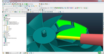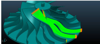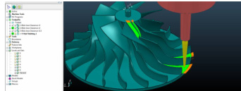 叶轮精加工策略里面设置设置参数基本相同,主要修改精加工刀路生成的公差,及精加工刀路切削行距及切削参数定义,例如切削转速切削进给。图 3-8 是叶轮精加工刀具路径生成后的效果。