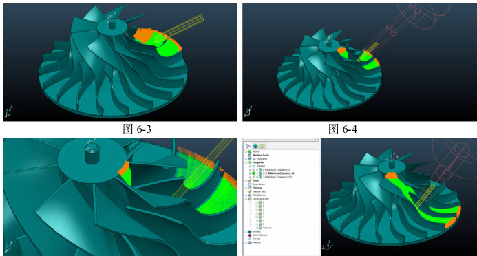 粗加工刀路生成后发现刀具路径没有完全生成,加工最后一层刀具路径没有加工到叶片底部(如图 3-5 所示),因为左右叶片和子叶片之间的距离小,再加上加工余量的原因使得左右叶片和子叶片之间距离变的更小,所以刀具路径不能加工到叶片底部。这个时候需要一把更小的刀具进行二次开粗,在计算二次开粗刀具路径的时候只需要生成有残留材料的地方,所以从编程技巧角度来讲,我们需要在 PowerSHAPE 软件中重新定义一个套(如图 3-6 所示),生成单独的残留加工刀路,避免走空刀时间,提高加工效率。如图 3-7 所示。