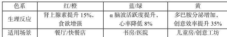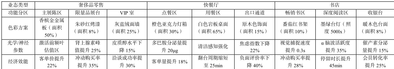 不同于居住空间设计,商业空间设计的主要目的是促进消费形成、推动经济行为发生。因此,在对商业空间进行设计时,要紧紧围绕神经决策干预理论和空间价值锚定机制。比如,神经科学实验数据显示:蓝色和绿色等冷色调波长 470~500nm ,可以有效延缓大脑对信息的处理速度,从而可以进一步延长决策筛选时间;红色和橙色等暖色调波长 630~740nm ,可以有效刺激肾上腺素分泌,进而可以在一定程度上加速消费冲动形成。神经营销学 fMRI 研究显示:香槟金和朱砂红等奢侈品色系,可以通过反射率 >90% 的光泽材质,切实提高消费者支付意愿。如表 3 为商业空间色彩设计参数与效用。