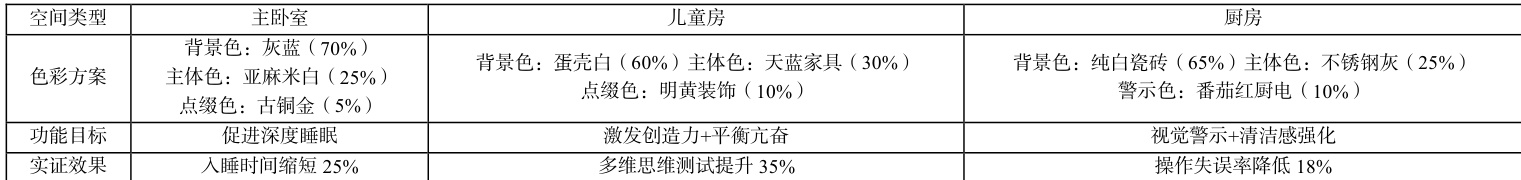 居住空间的色彩需要能够充分满足环境心理学和人体工程学的双重逻辑。例如,可以利用暖色调设计,实现边缘系统情感记忆触发,并帮助人们建立空间归属感;可以利用冷色调设计,实现皮质醇分泌抑制,并加速褪黑素生成;可以利用高明度边界色设计,切实强化空间辨识度,有效降低老年人跌倒概率,这符合适老化设计[3]。如表 2 所示为居住空间核心功能区色彩设计策略。