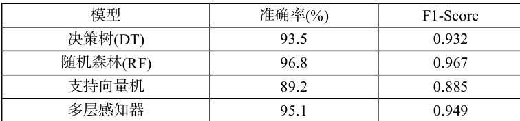 在模型选型上,本研究选取了四种代表性算法:决策树(DT)、随机森林(RF)、支持向量机(SVM)及多层感知器(MLP)。利用 Scikit-learn 机器学习库,我们将数据集按 7:3 比例划分为训练集与测试集。在训练阶段,我们采用十折交叉验证网格搜索技术对各类模型的核心超参数(如随机森林的树木数量与深度、SVM 的惩罚系数 C 与核函数)进行了优化调优,旨在提升模型的泛化性能与分类准确率。
