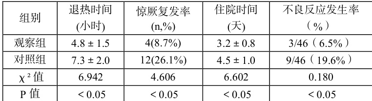本研究选择 92 例患儿作为研究对象,按照随机原则分成观察组和对照组,每组各包含 46 例样本。经统计学分析显示,两组在性别比例,年龄分布以及基础疾病特性等方面没有明显差别,表现出较高同质性。实验组当中,男性患儿有 23 例,女性患儿也有 23 例,年龄从 6 个月到 5 岁不等,平均年龄( 2.8±1.3 )岁,对照组为男性患儿 24 例,女性患儿 22 例,年龄范围同样如此,平均年龄( 2.7±1.2 )岁。全部入选的儿童都完成了系统的评估,而且做了详细的检查,排除了其他可能的病因,从而保证纳入者都是典型的热性惊厥病例。