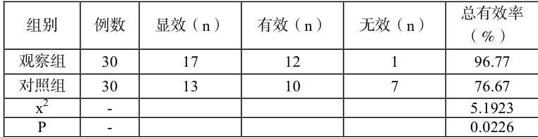 比较治疗效果,按照患者经治疗后恢复的情况,将其评价为显效、有效和无效。总有效率=(显效 +, 有效)/总例数 ×100% 。