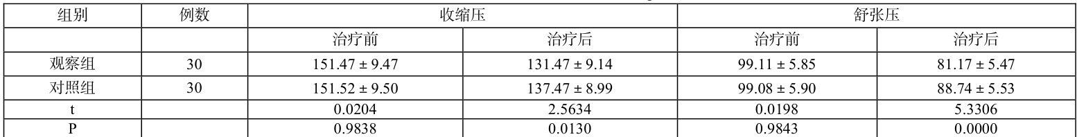 治疗前比较收缩压和舒张压,两组无差异, P>0.05 ,治疗后观察组收缩压和舒张压均低于对照组, P<0.05 ,见表 2。