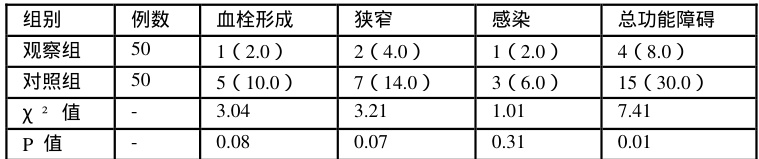 统计两组随访期间血栓形成、狭窄及感染的发生率,并计算总功能障碍发生率。