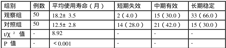 观察组内瘘平均使用寿命长于对照组,其使用寿命 ≤3 个月(短期失效)的患者占比低于对照组,而满 6 个月(长期稳定)者占比更高,各项差异均具统计学意义( P<0.05 ),具体数据详见表2。