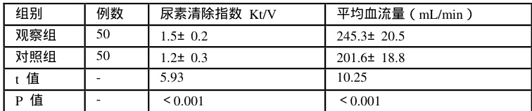 随访半年,测定两组尿素清除指数 Kt/V(透析充分性评判指标,达标值 ≥1.2 )与透析期间监测的平均血流量(达标值 ≥200mL/min )。