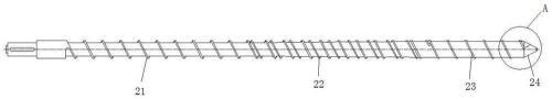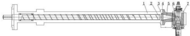 所述的 WDZ 低烟无卤材料的挤出机螺杆安装结构,包括机架、螺筒、连接机头的机颈、分料筒和上述的螺杆,所述螺筒(也叫炮筒)固定于所述机架上,所述螺杆是设计在螺筒内进行工作,所述机头是通过法兰固定于所述螺筒的一端,所述法兰内部具有机颈;所述螺杆位于所述螺筒内部,所述进料段与所述螺筒旋转连接,所述螺杆头延伸至所述机颈内;所述分料筒固定于所述机头的内部,且一端与所述机颈相通,另一端与所制品相通。