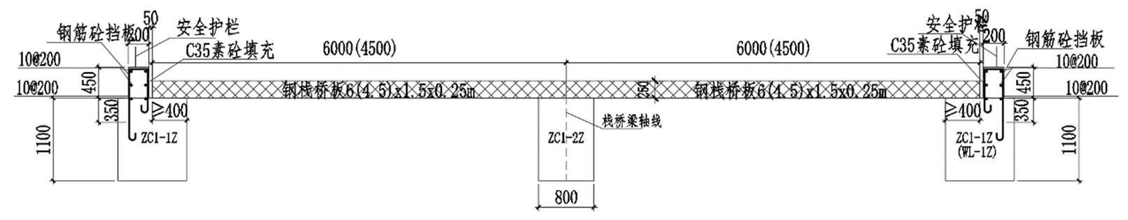 4)钢栈桥板整体铺设完成后用 C35 素混凝土填充两侧混凝土挡坎与钢栈桥板之间的缝隙。