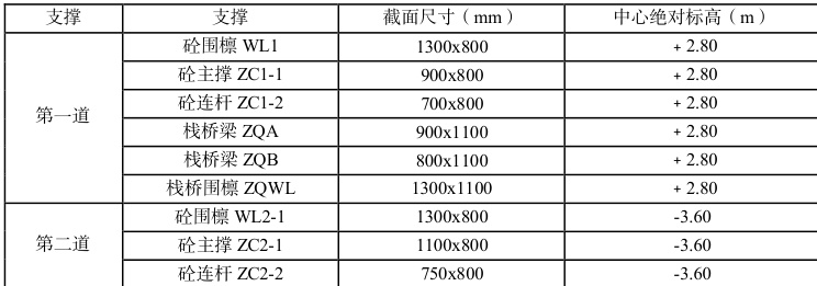 D2 地块基坑采用两道钢筋砼内支撑。支撑布置以对撑、角撑和边行架为主。本工程室外自然地面平均绝对标高 +3.30m 。具体支撑截面尺寸及布置详见下表: