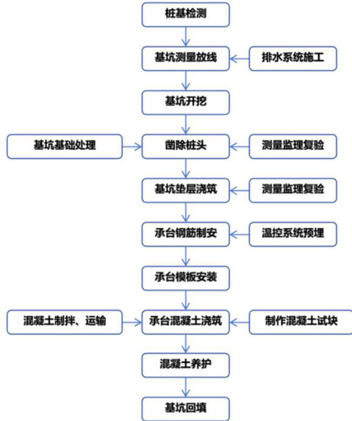 承台混凝土浇筑前,根据天气预报和气象站发布的温度信息,选择在当天温度最低的时候实施浇筑作业,混凝土入模温度应不低于 5℃,不得高于 35℃。从拌合站第一盘出料开始由工地试验室检测混凝土塌落度、扩展度、和易性、出料温度等关键参数,第一盘混凝土参数符合要求后,开始按照混凝土浇筑计划大批量供应施工现场。第一车混凝土罐车运输至施工桥位,再次现场实测混凝土各项指标,尤其是混凝土温度,需要现场使用混凝土测温计实测混凝土温度≤28℃,满足要求后,经现场监理工程师现场见证复核同意后,开始按方案实施承台混凝土浇筑。