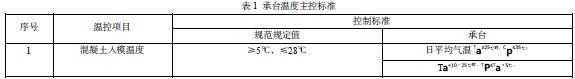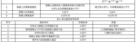 温度控制的方法和制度根据气温、混凝土配合比、结构尺寸、约束情况等具体条件确定。根据有限元仿真计算结果,根据现行规范、规程的相关要求,并结合本工程的实际情况,对大体积承台混凝土施工制定的温控标准见表1 和表2。