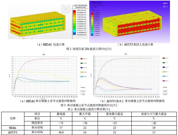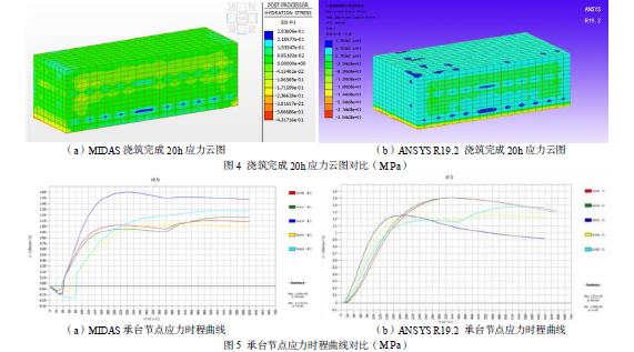 通过Midas 计算可知,承台混凝土最大拉应力为1.63MPa≤外约束拉应力1.75MPa。通过ANSYS 通用有限元分析软件计算可知,承台混凝土最大拉应力为1.52MPa≤外约束拉应力2.47MPa,故承台混凝土温度应力满足抗裂要求。