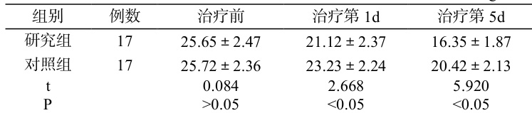 表 1 两组治疗前及治疗第 1d、第 5d 的颅内压比较(