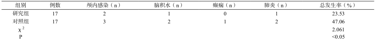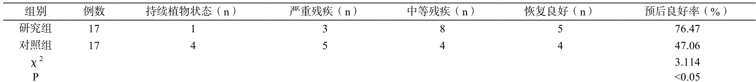 经统计计算,研究组预后良好率高于对照组( P<0.05 )。见表 2。