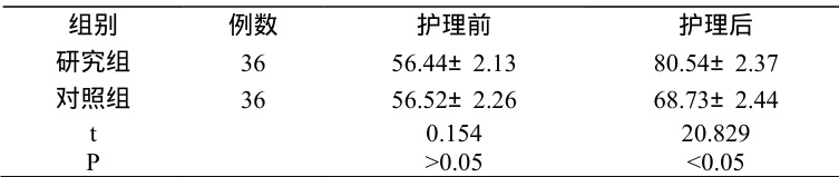 对比 SF-36 评分,护理前组间差异不明显( P>0.05 );护理后则形成较明显的差异( P<0.05 ),研究组评分更高。见表 2