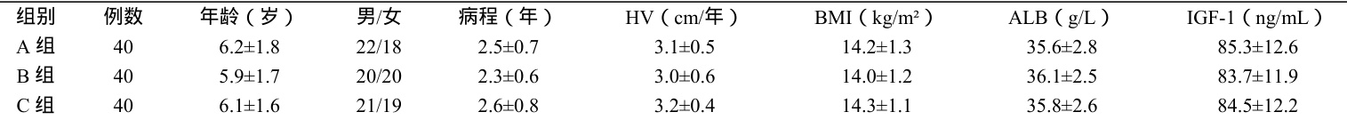 纳入标准:年龄3\~10 岁;身高低于同年龄、同性别儿童第3 百分位(依据2023 年《中国7 岁以下儿童生长标准》);血清白蛋白(ALB) <40g/ L,胰岛素样生长因子-1(IGF-1)低于同年龄参考值;排除慢性肾病、甲状腺功能减退等器质性疾病及生长激素缺乏症。采用随机数字表法分为三组各40 例,三组基线资料均衡可比( P>0.05 )。