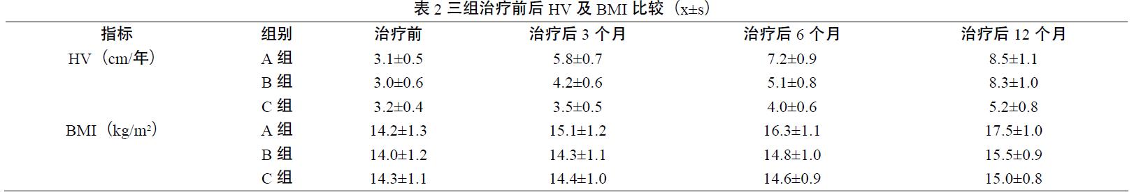 1.身高增长速度(HV):治疗后 3、6 个月,A 组 HV 显著高于 B 组与C 组( ρP<0.05 )(表2)。