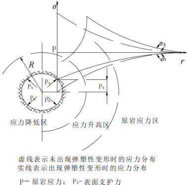 当回采后的一段时间,达到某一极限时,围岩就进了塑性状态,此时围岩就出现了不可恢复的变形。当足够大时,巷道围岩的塑性区会逐渐的向巷道内部进行快速的扩展,此时巷道围岩会形成一个较大的塑性区域,称之为塑性松动圈,和逐渐改变大小。由于塑性区的存在,减少非常大。巷道掘进后,范围不断扩大,巷道收敛。但当收敛位移过大时,岩体就会发生松动,失去自承能力,对支护系统产生“ ” ,P 也就增大。