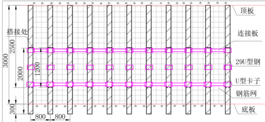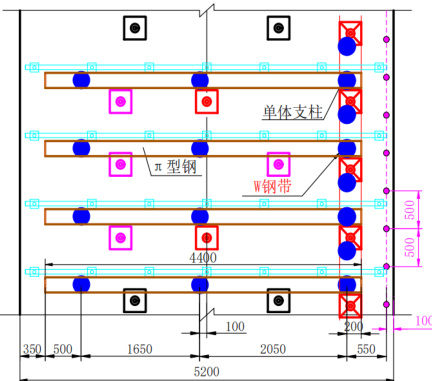 超前预裂切缝距采帮 0.2m 处施工孔深 3.5m、孔距 0.5m、孔径φ 80mm 的爆破孔。超前补强支护采用φ 21.8,L=6100mm 的恒阻大变形锚索+W 钢带的支护方式。段挡矸墙结构由外到内依次为 U 钢可缩支柱、金属网、挡杆布、钢筋网、金属网组成,具体布置如图 2 所示。架后顶板临时支护采用“ 一梁三柱” 的形式。π 梁间距 1000mm ,每排π 型梁下布置 3 棵单体点柱,第一棵距挡杆墙侧 550mm ,第二棵距挡杆侧 2600mm,第三棵距下帮侧 850mm。顶板不好时两排π 型梁中间位置打一棵单体点柱,距挡杆侧 550mm,具体布置形式如图 3 所示。