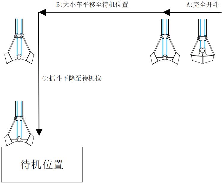C:大小车到达待机位置定位完成后,抓斗下降至待机位置停机。
