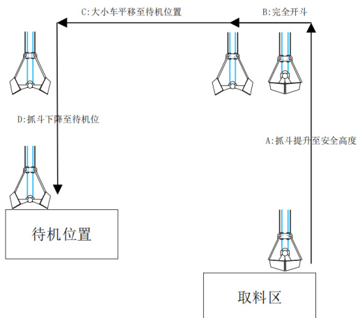 B:抓斗到达安全高度后大小车平移到取料位置;