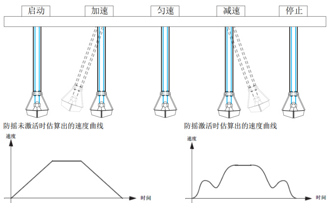 为了最大程度降低摆动,我们采用高性能驱动器内部集成防摇系统,在自动模式下运行时,防摇功能开启,以防止自动运行过程中由于抓斗摇晃造成碰撞事故的发生。在手动操作模式下,可由司机自行选择防摇开启或关闭防摇功能。防摇采用电子开环防摇,无需增加摆角检测装置,变频器通过编码器实时检测起升高度(即钢丝绳摆长),根据输出的速度和加速度,结合防摇摆的数学模型,实时计算并调整变频器的输出速度和加速度,从而达到防摇的目的。使用驱动器防摇功能,可以在起升高度全程范围内,有效防止大、小车运行负载的惯性冲击带来的吊钩摇摆。经过观察,防摇系统使得摇摆的幅度减少 95% 以上,可在大小车停止运行后的一个单摆周期内,负载的摆动幅度小于 1∘ 。