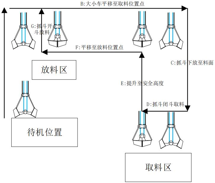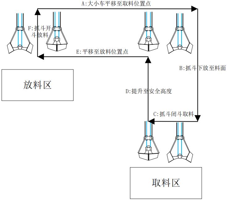 A:抓斗先从放料位置平移大小车到取料位置(若此时抓斗还未完全开斗,则在平移的过程中同时进行开斗动作);B:大小车到达取料位置并且开斗完成后,抓斗开始下降至料面快速减速停机;C:抓斗停稳后开始闭斗深挖取料;D:闭斗完成后,起升开始提升至安全高度,此时大小车不动作;E:在安全高度以上后,大小车开始联动平移至放料点;F:到达放料点后,抓斗开斗放料,开斗到达设定的开度后单个取放料循环完成。