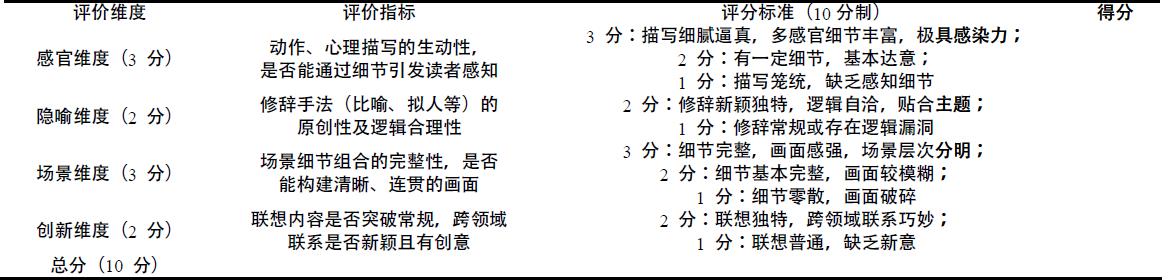 具象化写作评价标准应包括细节描写的真实生动程度、情境构建的完整性、语言表达的具体性与形象性等方面。例如,细节描写是否能够通过具体的感官体验(如视觉、听觉、触觉等)增强文章的感染力;情境构建是否能够为读者提供清晰的背景和场景;语言表达是否能够避免抽象化,转而使用更具画面感和表现力的词汇和句式。可形成如下的评价表格: