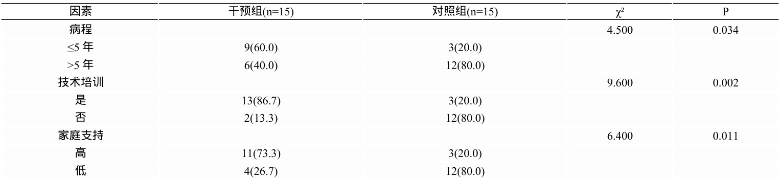 在 30 例患者中(干预组和对照组各 15 例),干预组依从性改善 11 例( 73.3% ),对照组改善3 例( 20.0% )。病程≤5 年、接受吸入技术培训、家庭支持度高是依从性改善的显著影响因素( P<0.01) 。见表 1