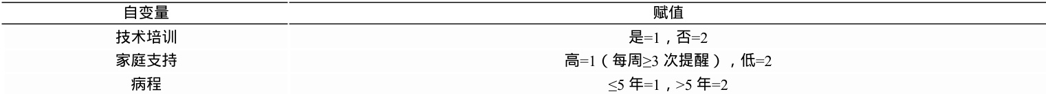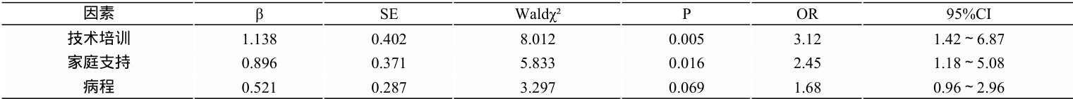 以依从性改善为因变量,单因素中 P<0.1 的变量纳入分析(自变量赋 值见表 2)。结果显示,技术培训(OR=3.12)和家庭支持(OR=2.45)是独 立影响因素(P<0.001)。见表 3。