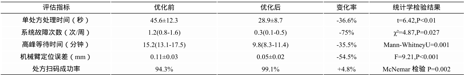 单处方处理时间从优化前的 45.6±12.3 秒缩短至 28.9±8.7 秒(t=6.42, P<0.01);高峰时段(9:00-11:00)吞吐量由 120±15 张/小时提升至 195±22 张/小时。