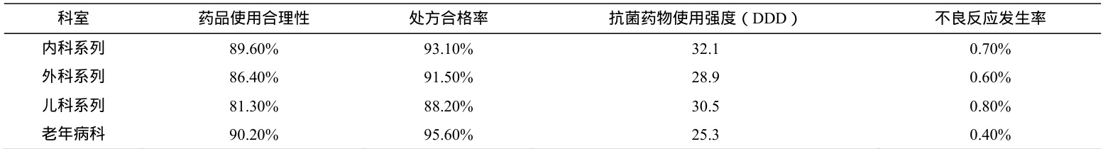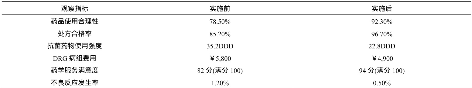 药品使用合理性、处方合格率、抗菌药物使用强度、DRG 病组费用、药学服务满意度及不良反应发生率。