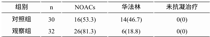 观察组 NOACs 使用率显著高于对照组( 81.3%vs53.3% , P=0.012 ,χ2=6.24⋅ ),而华法林使用率降低 18.8%vs46.7% ),差异有统计学意义(表1)