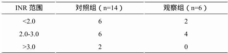 观察组华法林患者 INR 达标率( 66.7% )高于对照组( 42.9% ),但差异无统计学意义( P=0.105 ),可能与样本量较小有关(表3)。