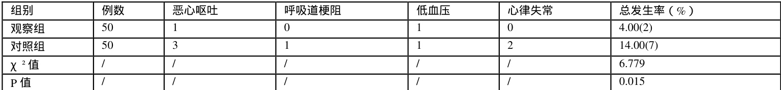 比较两组并发症发生率,包括恶心呕吐、呼吸道梗阻、低血压、心律失常等;