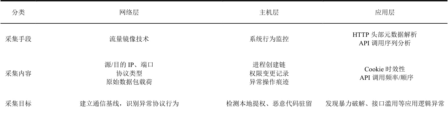 面性与特征的有效性。为实现多维度威胁感知,本方法构建了分层数据采集体系,如表1 所示: