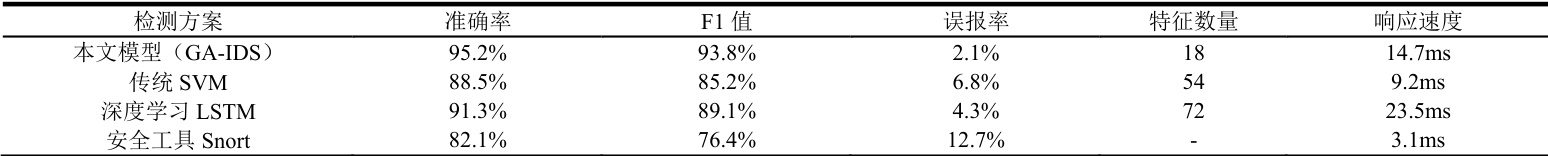 GA-IDS 通过多目标遗传算法显著提升检测性能,准确率提高 6.7–8.4个百分点,F1 值上升8.6–12.4,误报率低至 2.1% ,较传统工具下降 83.5% 。系统动态压缩特征 68% 至18 个,响应稳定在 15ms 内。智能权重调节在降低误报 32% 的同时仅牺牲 1.8% 检出率,特征筛选剔除冗余参数使训练效率提升 130% ,显著增强优化效率与检测鲁棒性。