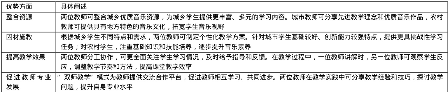 在“ 双师教学” 模式的实施过程中,运用了全方位的、动态优化的评价机制。首先进行学生评价。以此精准把握教学成效。在这个过程中,教师可以采用问卷调查、小组讨论等形式广泛收集学生对“ 双师教学” 的反馈,深入了解学生学习需求与满意度,以此为调整教学策略的依据,确保教学内容与方法契合学生实际。其次定期开展教学反思。两位教师坚持深度交流与观摩学习,系统总结教学中的利弊,直面教学过程中的不足,在思维碰撞中不断优化教学方法,实现教学能力的不断升。最终形成持续改进的闭环。既根据学生评价与教师反思成果进行综合,不断更新音乐教学资源库,保持教学内容的前沿性与多样性,又通过精细化调整教学流程,强化课堂互动效率,确保“ 双师教学” 模式始终保持强劲生命力,为城乡音乐教育均衡发展提供可持续的优质支撑。
