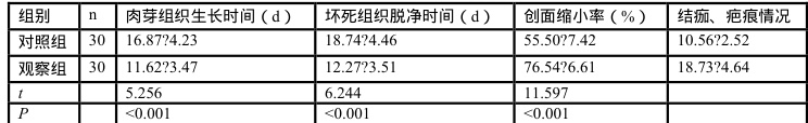 (1)创面恢复:对比两组肉芽组织生长时间、坏死组织脱净时间、创面缩小率、结痂、疤痕情况。