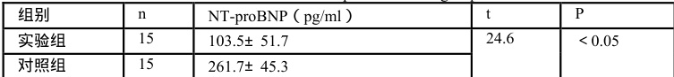 实验组的血清 NT-proBNP 水平为 103.5± 51.7pg/ml ,对照组的血清 NT-proBNP 水平为261.7± 45.3pg/ml ,实验组明显低于对照组,差异有统计学意义 (P<0.05) ,(见表1)。