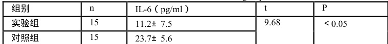 实验组的血清 IL-6 水平为 11.2±7.5pg/ml ,对照组的血清 IL-6 水平为 23.7±5.6ng/ml ,实验组明显低于对照组,差异有统计学意义 P<0.05} ),(见表2)。