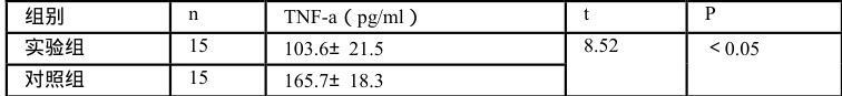 实验组的血清 TNF-α 水平为 103.6± 21.5pg/ml ,对照组的血清 TNF-α 水平为 165.7±18.3ng/ml ,实验组明显低于对照组,差异有统计学意义 (P<0.05) ,(见表2)。