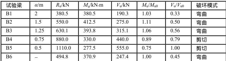 梁B6 在两点加载下呈现出典型的弯曲破坏模式,其抗弯承载力 Mu0 为 370.9kN*m ,从表3 可以看出,梁 B1~B3 的剪力水平 VU/VU0 处于在 0.33~0.58 内,当剪力水平较小时其抗弯承载力在剪力作用下并未出现折减;当位于高剪力水平下时,梁 B4~B5 的表现为剪切破坏模式,其抗弯承载力有较为明显的衰减,见图 9