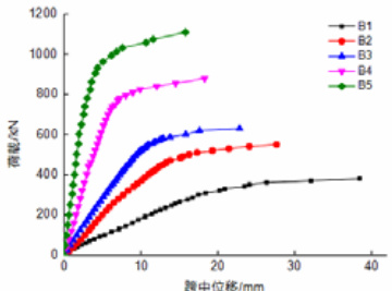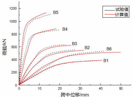 图 13 给出了梁 B1~B6 非线性计算结果与试验结果的荷载位移曲线。