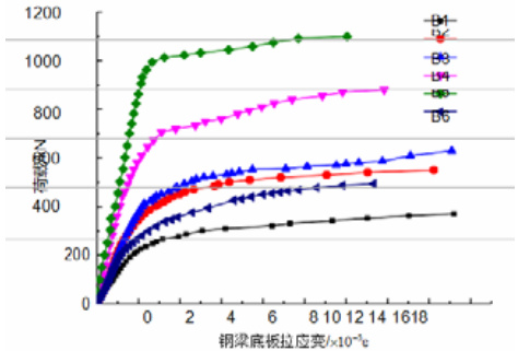 图10 钢梁下翼缘的荷载-应变图