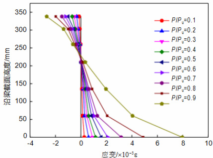 图 11 给出了跨中截面沿梁高应变分布图。图中结果表明:在弹性阶段,沿梁高截面应变呈线性分布,接近极限状态时钢混界面处由于存在滑移而使得应变曲线略微突变。从总体上看,试验梁应变沿梁高分布基本满足平截面假定。